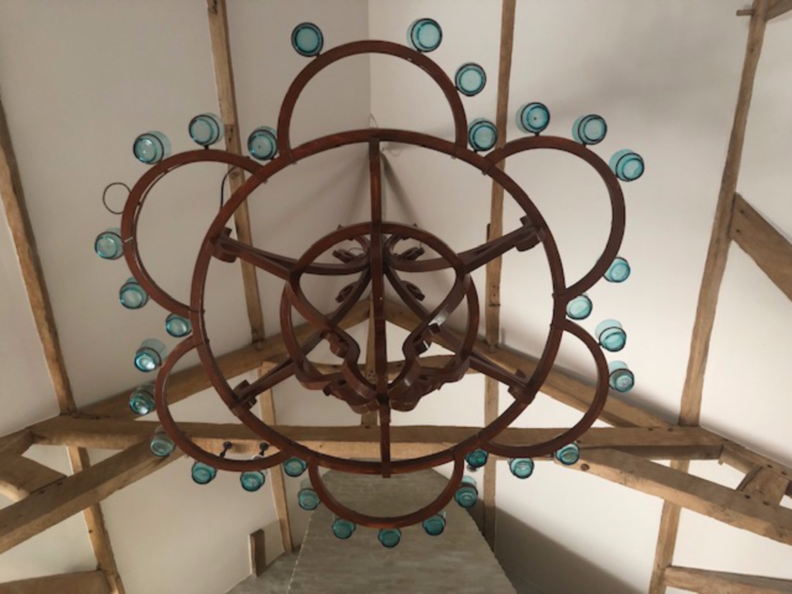 dark red/aubergine 'sang de boeuf 'colored wood structure and turquoise glass gobelets